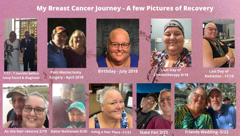 In 2018, while doing a self-breast exam I noticed a lump at the base of my breast. So, I consulted my doctor, had a mammogram, sonogram, biopsy. After consulting with my primary doctor and the doctor at Moffitt, I chose to have a partial mastectomy and a reduction. Once the wounds were healed, I then moved forward with chemotherapy and then radiation. After the eight months after the surgery, recovery, treatment, hair loss, and life in general, I was able to ring the bell that I was cancer free.